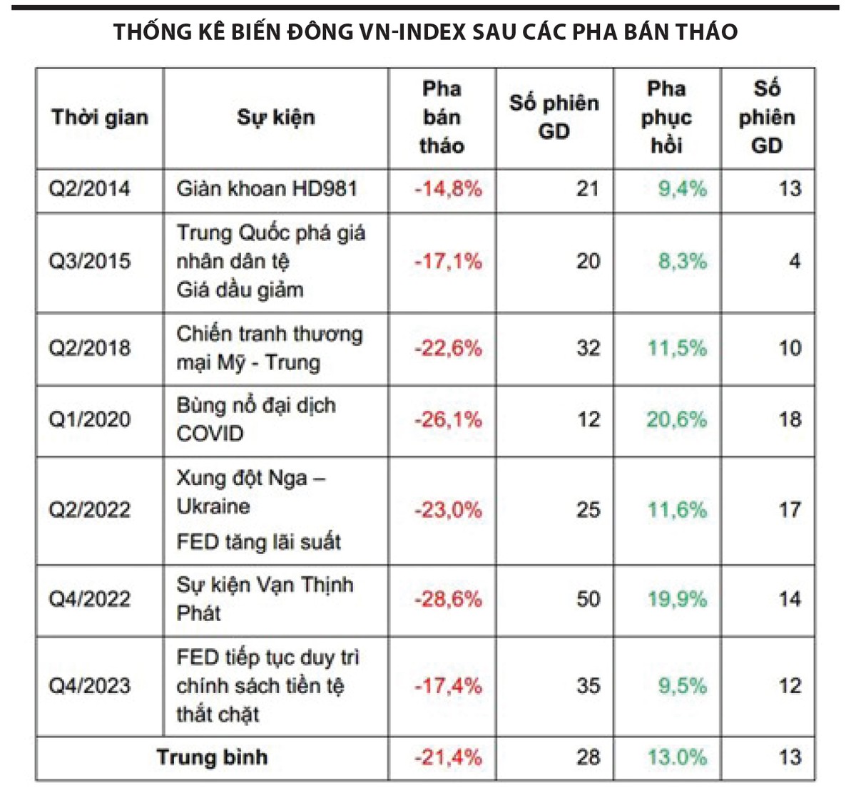 Thống kê lịch sử cho thấy những con số về đặc điểm nhịp phục hồi sau những pha bán tháo diện rộng chịu ảnh hưởng bởi tin tức của VN-Index. Trong 10 năm trở lại đây, chỉ số có 7 đợt sụt giảm bởi các sự kiện tác động và có mức giảm trung bình 21,4%. Đáng chú ý, mức tăng của VN-Index trong nhịp phục hồi đầu tiên thường thấp hơn đáng kể so với số điểm đánh mất trong giai đoạn bán tháo, đồng thời số phiên duy trì cho đợt phục hồi cũng ngắn hơn (xem bảng).