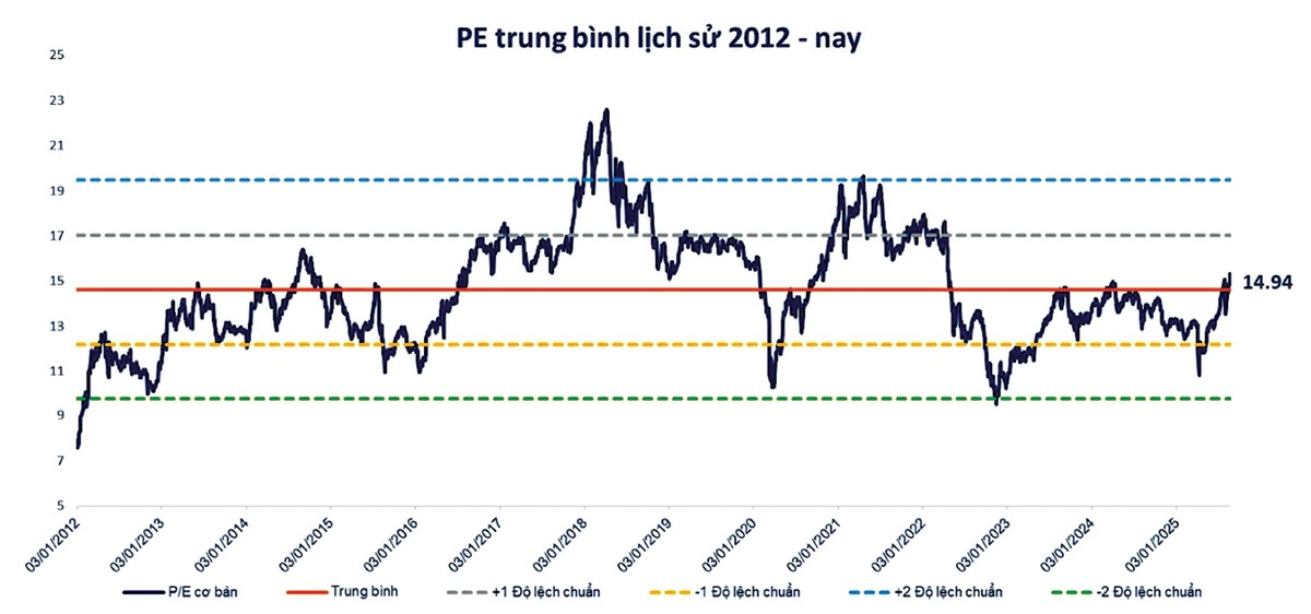 Tuy nhiên, nếu xét về tổng thể, định giá của VN-Index vẫn còn dư địa để tăng trưởng. Chỉ số P/E hiện tại quanh mức 15 lần, nếu tính theo dự phóng thì chỉ khoảng 13,4 lần, vẫn thấp hơn nhiều so với đỉnh của các chu kỳ trước (25,3 lần, 18 lần). Hơn nữa, lợi nhuận doanh nghiệp năm 2025 được dự báo tăng 15,6%, cho thấy đợt tăng giá này được nâng đỡ bởi yếu tố nền tảng vững chắc, chứ không chỉ nhờ dòng tiền đầu cơ ngắn hạn.