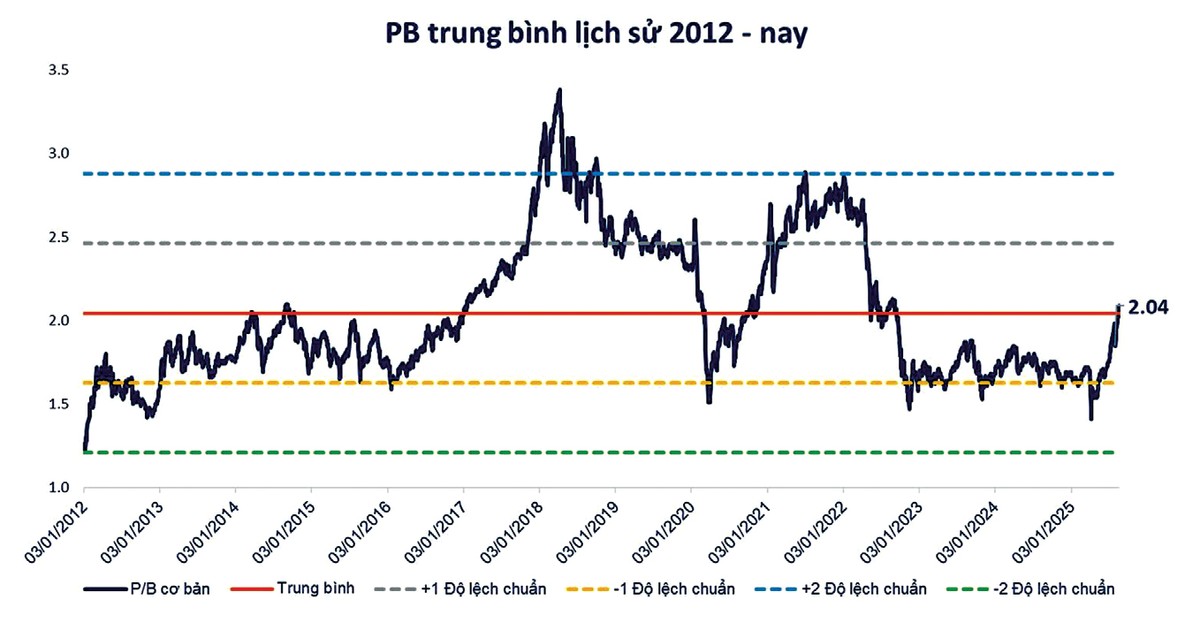 Theo Agriseco Research, hiện tại, VN-Index đang giao dịch ở mức P/E khoảng 15,2 lần, tiến sát ngưỡng 15,45 lần - tương ứng vùng 1.700 điểm và cũng là mức cao hơn 2 độ lệch chuẩn so với bình quân 3 năm gần nhất. Điều này cho thấy, thị trường đã thoát khỏi vùng định giá thấp, dư địa tăng trưởng tiếp theo sẽ phụ thuộc nhiều hơn vào yếu tố cơ bản, thay vì chỉ dựa vào kỳ vọng dòng tiền.