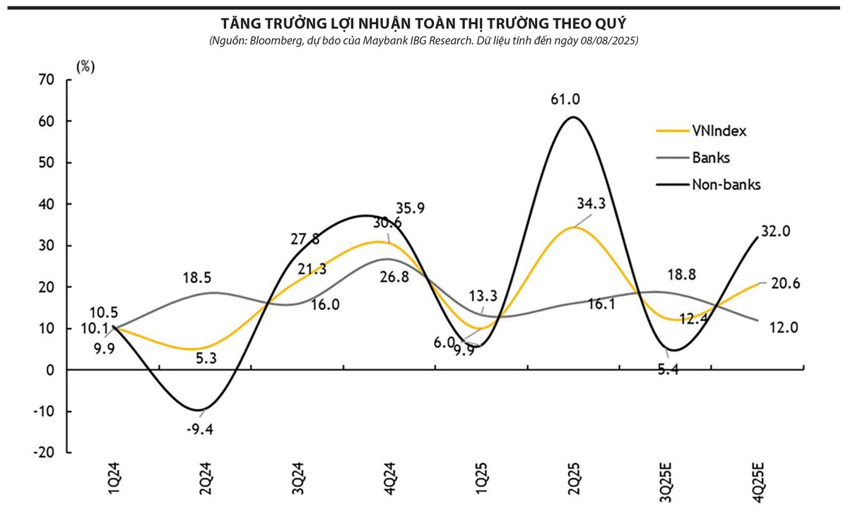 Kết quả khảo sát từ danh mục phân tích của Rồng Việt cho thấy xu hướng tăng trưởng vẫn tích cực: lợi nhuận quý III/2025 dự kiến tăng 22% so với cùng kỳ, cao hơn mức dự phóng top-down 15%. Thị trường cũng đã điều chỉnh kỳ vọng tăng trưởng lợi nhuận năm 2025 của các doanh nghiệp niêm yết lên mức tích cực hơn từ cuối tháng 7.