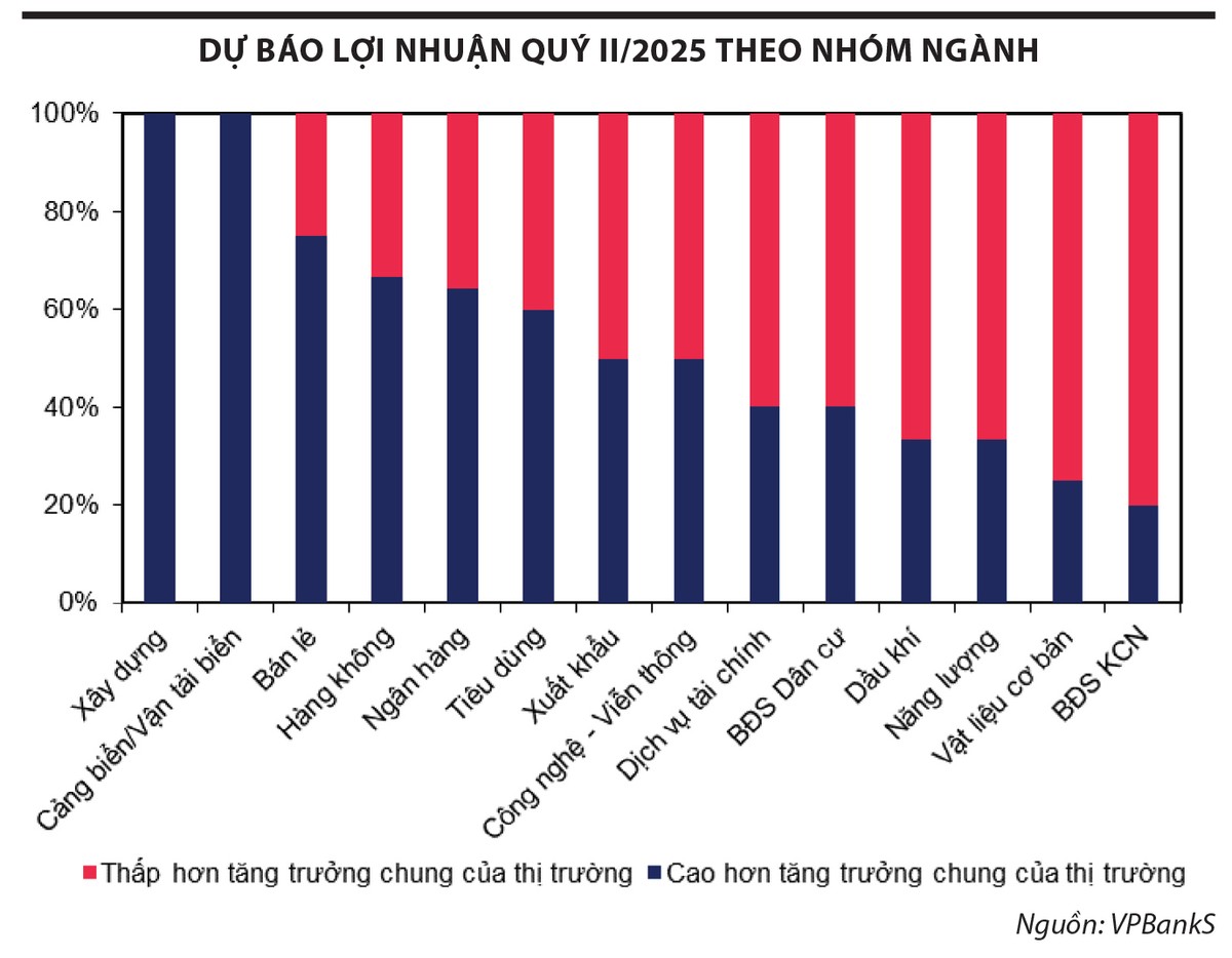 Theo ông Nguyễn Tiến Dũng, nhóm xuất khẩu và logistics được hưởng lợi trong quý II nhờ tình hình thương mại sôi động do quyết định hoãn thuế quan 90 ngày, do đó kết quả kinh doanh sẽ ghi nhận những con số tích cực. Tuy nhiên, việc các đơn hàng được đẩy lên trước có thể khiến tình hình kinh doanh nửa cuối năm 2025 ảm đạm hơn. Ngược lại, một số nhóm ngành ghi nhận kết quả kinh doanh không quá tệ nhưng giá cổ phiếu lại giảm trong quý II có thể mang đến cơ hội đầu tư trong thời gian tới.
