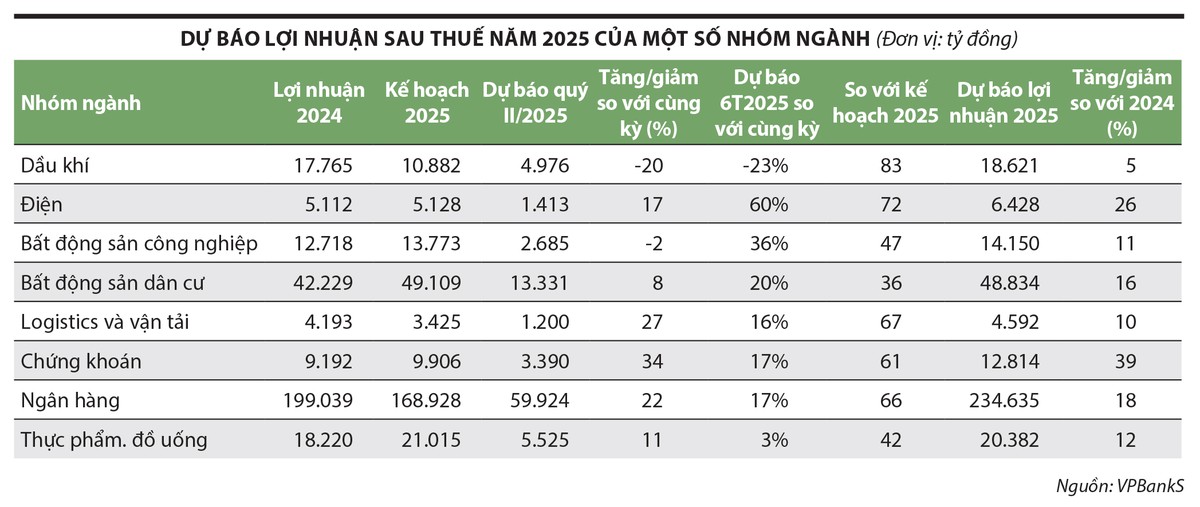 Dựa trên dự báo kết quả kinh doanh quý II và triển vọng từ nay tới cuối năm, ông Đào Hồng Dương, Giám đốc Phân tích cổ phiếu, Công ty Chứng khoán VPBank (VPBankS) cho rằng, các nhóm ngành ngân hàng, chứng khoán, vật liệu cơ bản, xây dựng sẽ có nhiều cơ hội đầu tư cho giai đoạn nửa cuối năm 2025. Trong danh sách cổ phiếu VPBankS theo dõi, tổng lợi nhuận sau thuế của nhóm này năm 2024 chiếm 67% tổng lợi nhuận các doanh nghiệp niêm yết trên HOSE và HNX, có thể tăng trưởng 16% trong năm 2025 (xem bảng).