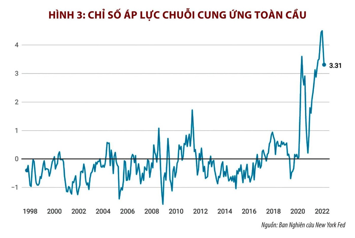 Hình 3 cho thấy áp lực chuỗi cung ứng toàn cầu đã giảm từ 3,82 vào tháng 1/2022 còn 3,31 vào 2/2202, nhưng vẫn ở mức rất cao. Số liệu tháng 3 - 4/2022 chưa được cập nhật nhưng chắc chắn tăng cao hơn do ảnh hưởng của xung đột Nga - Ukraine và các biện pháp trừng phạt lẫn nhau giữa Nga và phương Tây. Đồng thời, việc Trung Quốc đang chật vật chống dịch Covid-19 theo chiến lược Zero Covid cũng làm cho chuỗi cung ứng bị gián đoạn càng dài. Những yếu tố này đang làm cho áp lực tăng giá vận tải, giá nhiên liệu, giá các nguyên vật liệu cơ bản đang tăng, tạo ra nguy cơ lạm phát chi phí đẩy tại Việt Nam.