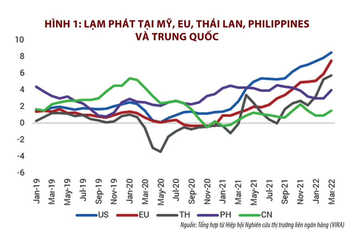 Trong những tháng gần đây, lạm phát đã tăng nhanh trên thế giới. Lạm phát tại Mỹ đã tăng lên 8,5% vào cuối tháng 3/2022 và ở mức 8,3% trong tháng 4/2022. EU cũng đang chịu áp lực lạm phát lớn nhất trong 30 năm qua lên đến 7,5%. Lạm phát tại các nước châu Á mặc dù thấp hơn nhưng đang trong xu hướng tăng lên (hình 1).