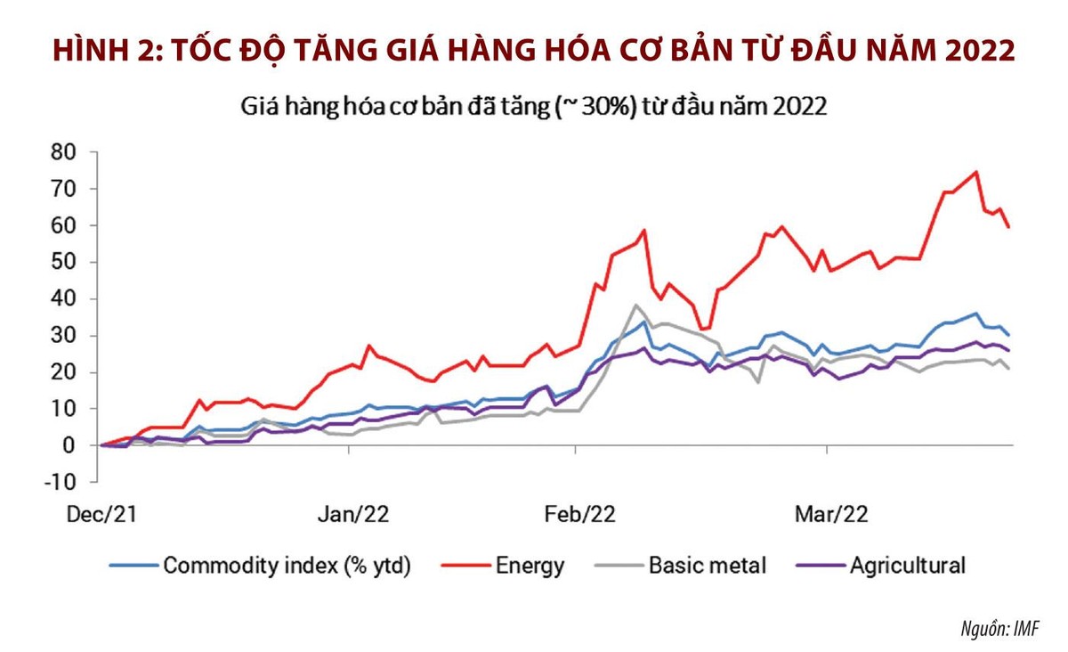 Nguyên nhân của lạm phát bùng phát hiện nay tại các nước Âu, Mỹ bao gồm cả từ phía cung và cầu. Về phía tổng cung, do xung đột vũ trang Nga - Ukraine đã làm cho giá cả hàng loạt mặt hàng cơ bản tăng cao. Giá dầu WTI đã tăng 42,9% so với đầu năm 2022. Tính đến 21/4/2022, giá hàng hóa cơ bản trên thế giới từ đầu năm đã tăng vọt lên đến 32%, trong đó riêng mặt hàng năng lượng đã tăng 60%, hàng nông sản tăng 26%, hàng kim loại tăng 21% (hình 2).