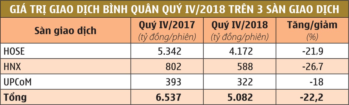 Kết thúc phiên giao dịch ngày 28/12/2018 tại 892,54 điểm, VN-Index đã giảm 9,32% so với đầu năm. Riêng quý IV/2018, điểm số đã giảm 12,2%, giá trị giao dịch bình quân của cả 3 sàn cũng chỉ đạt 5.082 tỷ đồng/phiên, giảm 22,2% so với bình quân cùng kỳ 2017. So với trung bình 9 tháng đầu năm, giá trị giao dịch quý IV giảm tới 29,7%.