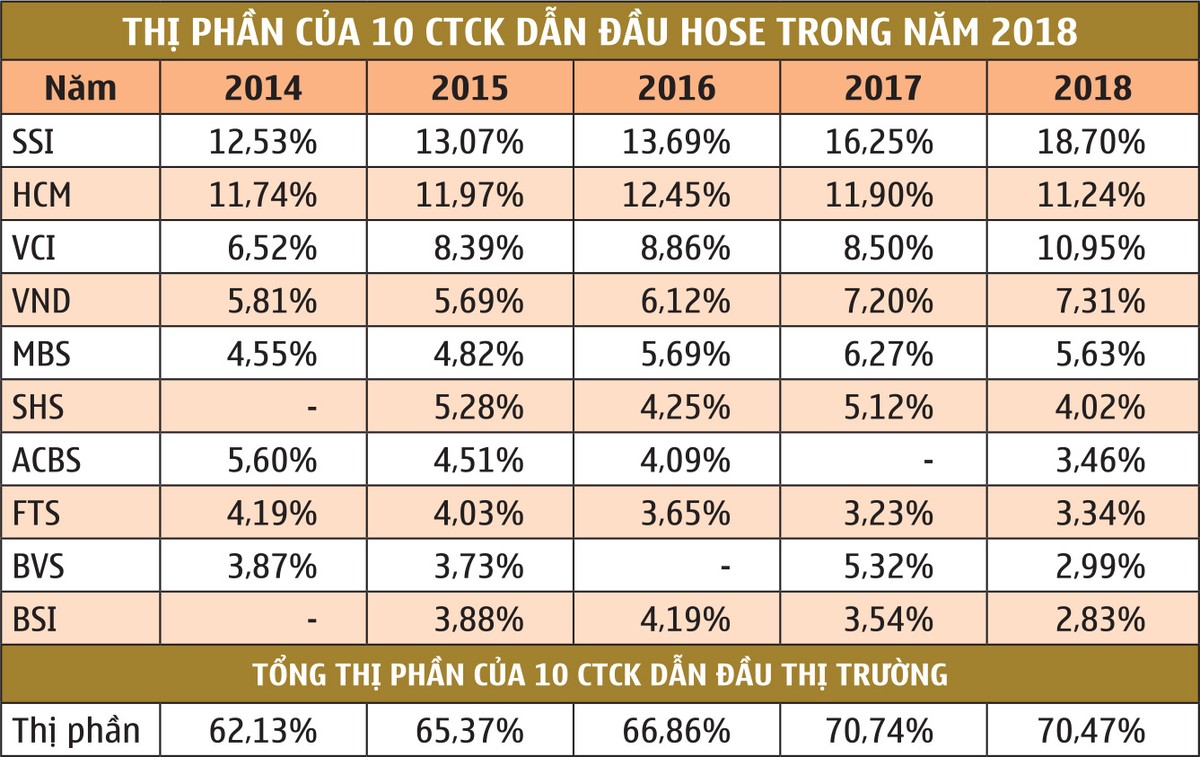 Dù xét về giá trị, tổng thị phần của 10 CTCK dẫn đầu trên HOSE năm 2018 vẫn tương đương với năm 2017 với hơn 70,47% và thứ tự Top 5 cũng hầu như không thay đổi, lần lượt là SSI, HCM, VCI, VND và MBS, nhưng sự phân hóa diễn ra rõ nét.
