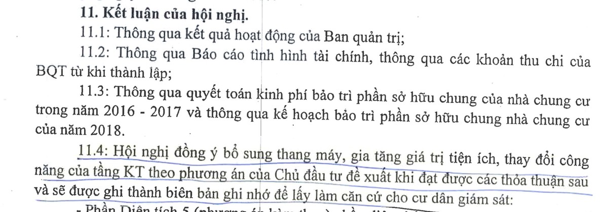Với mong muốn cải thiện công năng, Công ty đã dành thời gian nghiên cứu, thiết kế và tự bỏ toàn bộ chi phí ra để thực hiện việc này. Trên cơ sở thống nhất, chủ trương này đã được thông qua trong “Hội nghị thường niên năm 2016-2017 cụm nhà chung cư Golden Land - N01” vào ngày 17/12/2017, trong đó phần kết luận của Biên bản Hội nghị ghi rõ “Đồng ý bổ sung thang máy, gia tăng giá trị tiện ích, thay đổi công năng của tầng KT theo phương án của chủ đầu tư”.