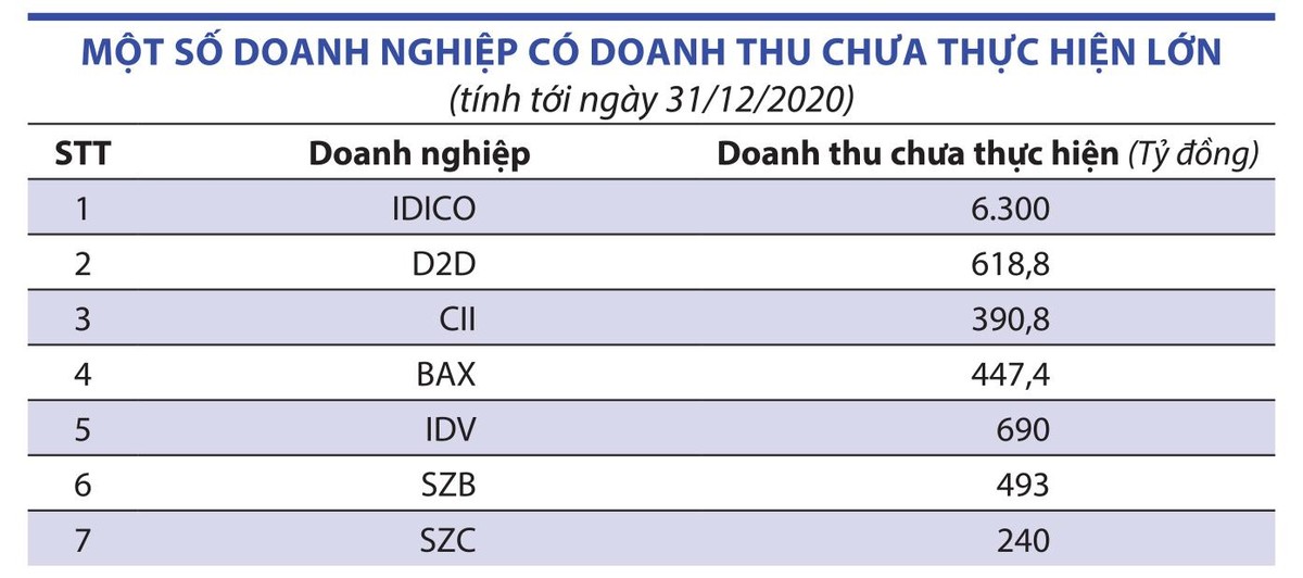 Với trường hợp của Tổng công ty IDICO - CTCP (mã IDC), báo cáo tài chính quý IV/2020 thể hiện, IDC có khoảng 6.300 tỷ đồng doanh thu chưa thực hiện, chủ yếu là tiền cho thuê đất, phí quản lý và sử dụng hạ tầng nhận trước tại các khu công nghiệp - là một trong những doanh nghiệp có doanh thu chưa thực hiện lớn nhất toàn ngành hiện nay.