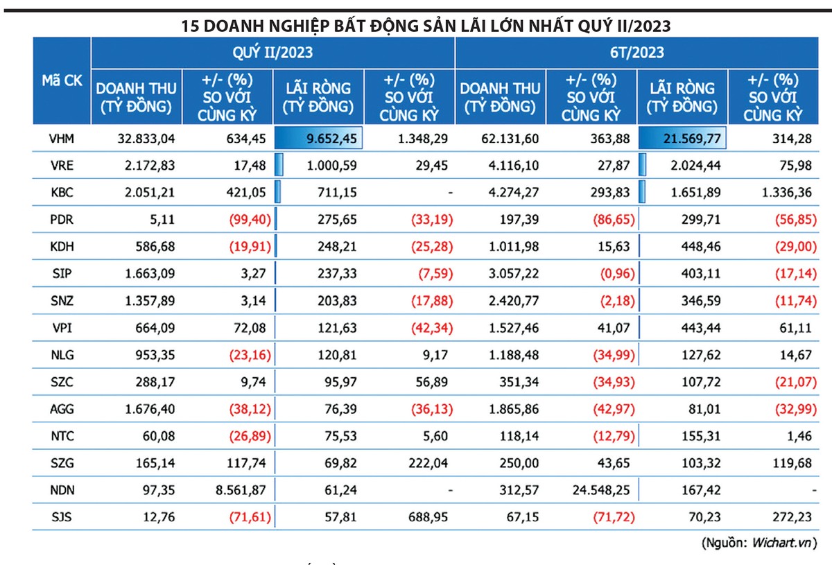 Xét 15 doanh nghiệp bất động sản báo lãi cao nhất trong quý II/2023, có 7 doanh nghiệp ghi nhận lợi nhuận tăng so với cùng kỳ, trong đó mức tăng cao nhất thuộc về Vinhomes (+1.348%) và khiêm tốn nhất là Nam Long (+9,17%).