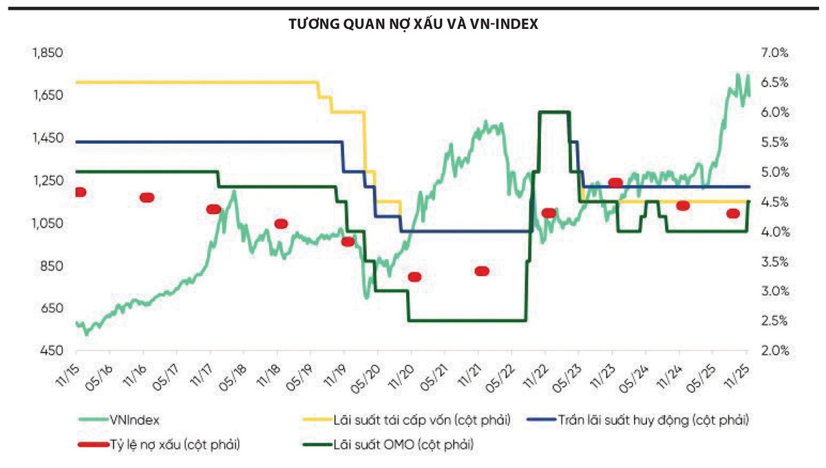 Quan trọng hơn, biến động của thị trường chứng khoán Việt Nam trong dài hạn có mối tương quan chặt chẽ hơn với xu hướng nợ xấu tiềm ẩn trong hệ thống ngân hàng, thay vì với các điều chỉnh nhỏ của lãi suất điều hành. Khi nợ xấu đã đạt đỉnh vào năm 2023 và cải thiện rõ rệt từ 2024 - 2025, thị trường hiện vẫn đang ở giai đoạn giữa của chu kỳ tăng trưởng (xem biểu đồ).