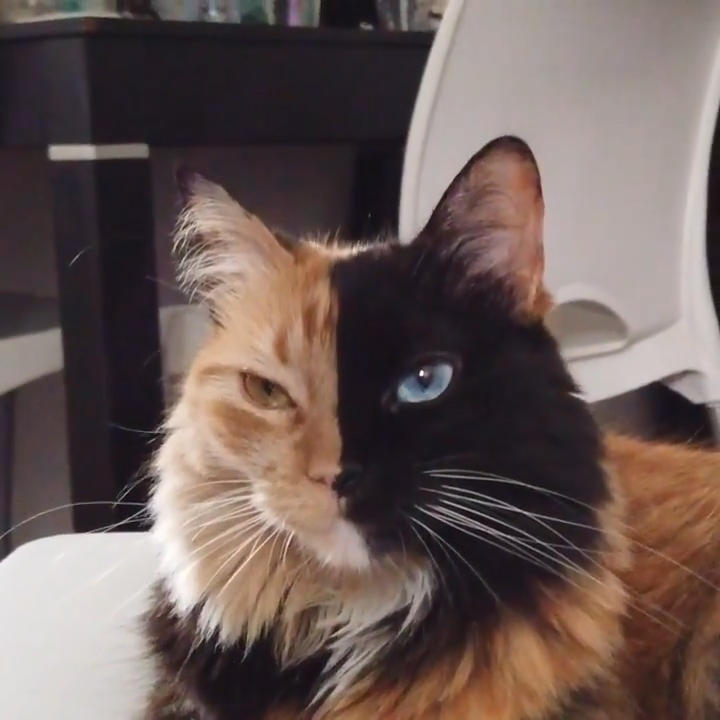 Theo đó, chú mèo này được phối màu một cách độc nhất vô nhị, cảm giác như có hai khuôn mặt (một đen một vàng) cùng với đôi mắt cũng đặc biệt vô cùng với mắt trái màu vàng như hổ phách, mắt phải màu xanh dương như loại đá Topaz Blue sáng và đẹp. Sự phân chia màu sắc còn được kéo dài từ ngực cho đến chân trước của con mèo với các bên màu được đảo ngược.