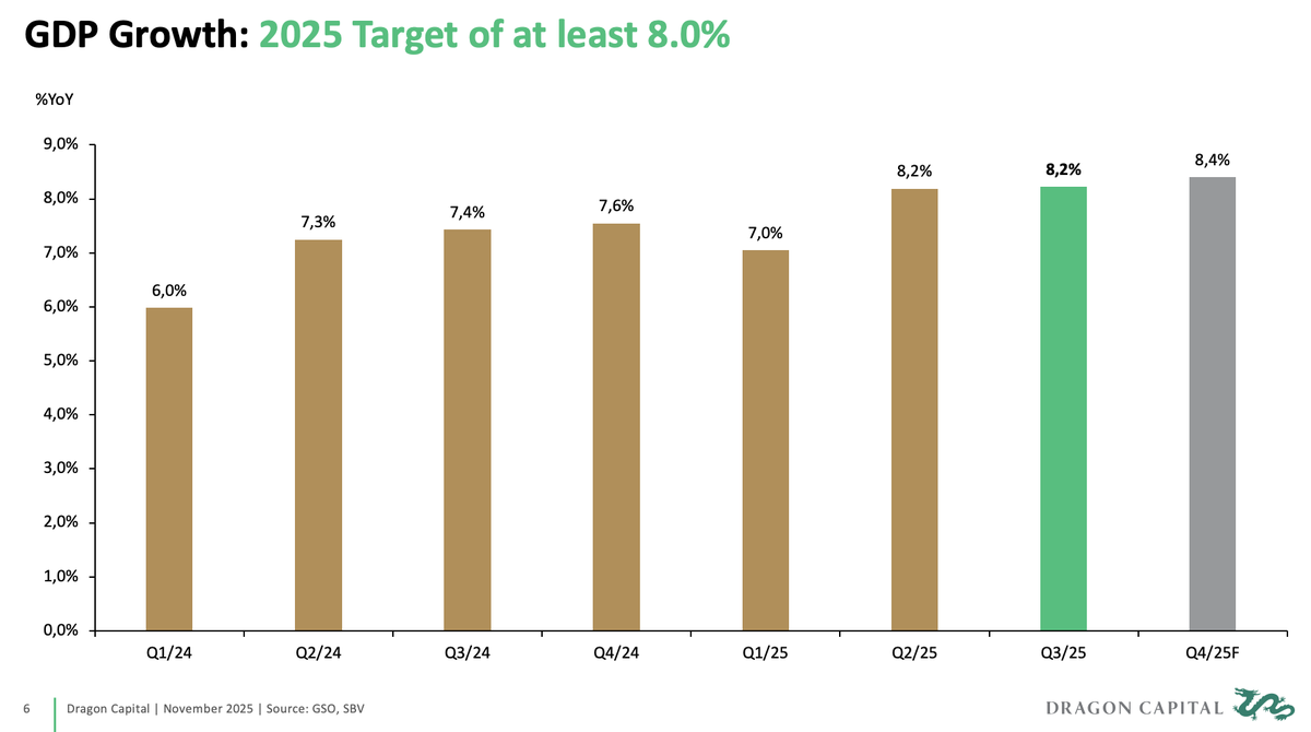 Tại Việt Nam, bức tranh có phần tích cực hơn. Nhờ sự hỗ trợ của Chính phủ và các chính sách điều hành, tăng trưởng các quý và cả năm 2025 vẫn duy trì ở mức tương đối lạc quan, dù thiên tai có thể gây ảnh hưởng đến GDP. Bước sang năm 2026, mục tiêu tăng trưởng GDP 10% đã được nêu rõ, đây không chỉ là vấn đề con số mà còn là vấn đề niềm tin, và niềm tin sẽ có tác động rất lớn đến kết quả tăng trưởng.