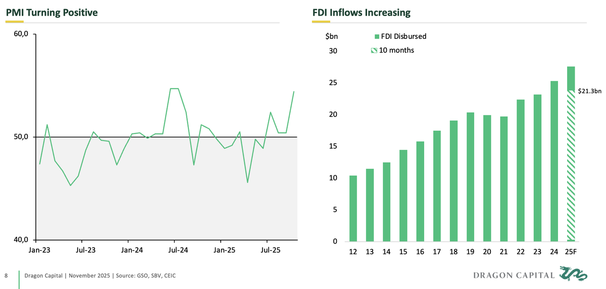 Theo ông Dominic Scriven, chỉ số PMI từ đầu năm 2025 đến nay liên tục cải thiện, hoạt động đầu tư nước ngoài cũng duy trì khả quan. Đặc biệt, dòng vốn FDI đã bắt đầu xuất hiện trong các lĩnh vực khác như bất động sản, thay vì công nghiệp - sản xuất như trước đây.