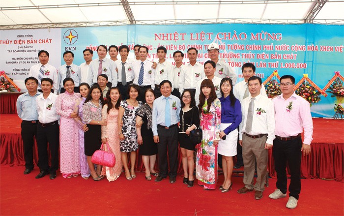 Ông Bùi Dương Hùng cùng cán bộ nhân viên trong lễ kỷ niệm khối bê tông đầm lăn thứ 1 triệu tại công trình thủy điện Bản Chát