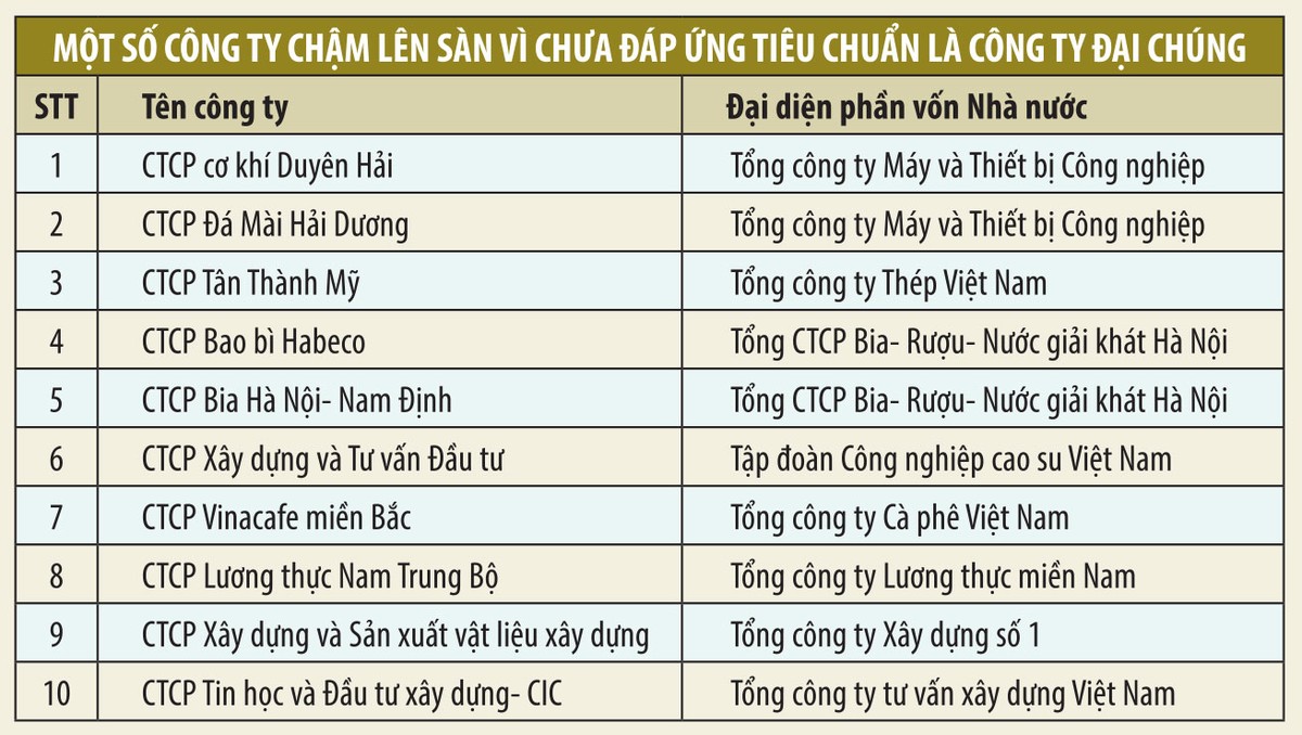 Trong số hơn 700 công ty cổ phần hình thành sau cổ phần hóa doanh nghiệp nhà nước đến nay chưa đăng ký giao dịch, niêm yết trên thị trường chứng khoán như quy định, có rất nhiều doanh nghiệp chậm lên sàn do chưa đáp ứng tiêu chí là công ty đại chúng (có từ 100 nhà đầu tư trở lên, không kể nhà đầu tư chứng khoán chuyên nghiệp và có vốn điều lệ đã góp từ 10 đồng trở lên).