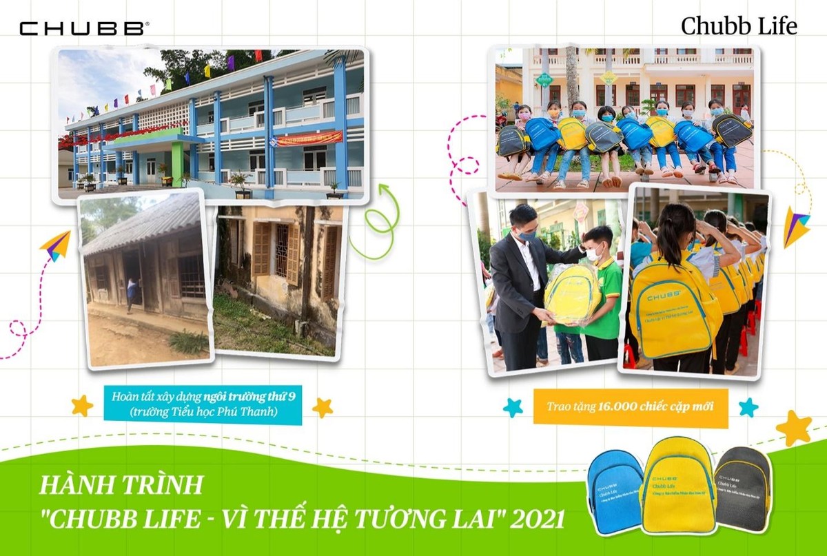 Trước đó, hành trình “Chubb Life - Vì thế hệ tương lai” được diễn ra với nhiều hoạt động trao tặng hơn 15.000 chiếc áo ấm tinh tươm đến các em học sinh có hoàn cảnh khó khăn tại các tỉnh miền Trung chịu thiệt hại nặng nề trong mùa mưa bão; hỗ trợ trang thiết bị dạy và học; trao học bổng cho các em học sinh hiếu học có hoàn cảnh khó khăn; hỗ trợ giáo dục thông qua việc tài trợ xây 9 ngôi trường học mới. Chỉ tính riêng các hoạt động hỗ trợ giáo dục. Đến nay, Chubb Life Việt Nam phối hợp cùng Quỹ thiện nguyện Chubb Charitable Foundation - International đã đóng góp hơn 31 tỷ đồng.