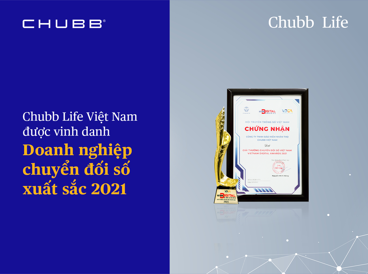 Với việc sớm thực hiện việc chuyển đổi số và đã gặt gái được những thành công nhất định, mới đây, Chubb Life Việt Nam cũng đã được vinh danh là Doanh nghiệp chuyển đổi số xuất sắc 2021. Đây là giải thưởng do Hội Truyền thông số Việt Nam (VDCA) tổ chức. Giải thưởng được trao cho những giải pháp chuyển đổi số của các đơn vị, tổ chức có thành tựu trong công cuộc chuyển đổi số, phát triển kinh tế số của Việt Nam.