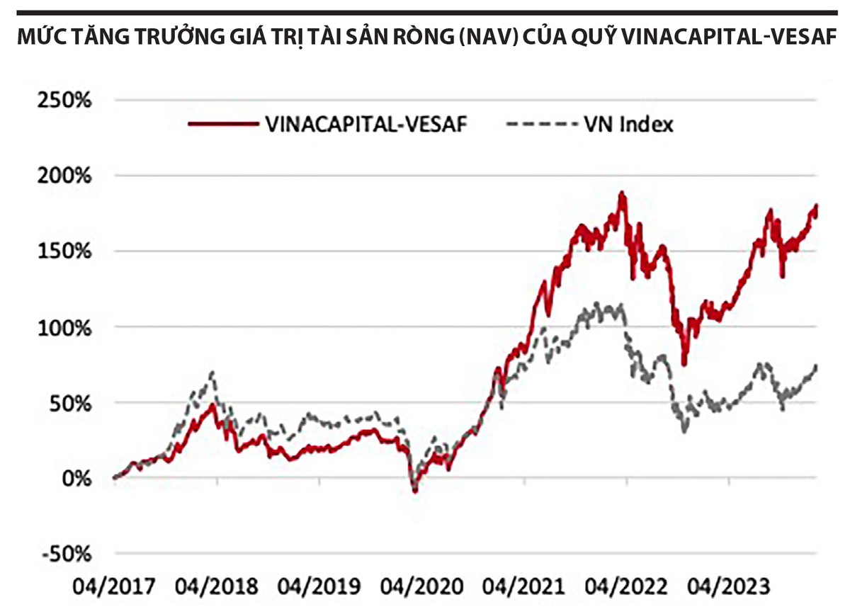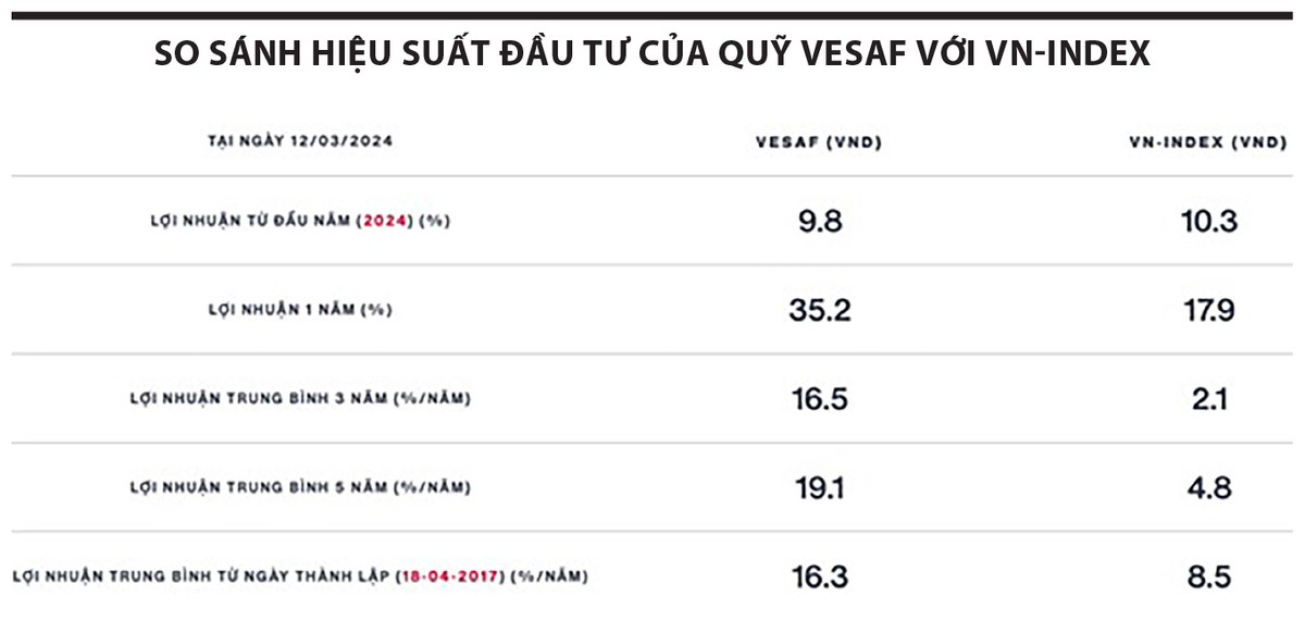Đơn cử, kể từ đầu năm 2024 tới ngày 12/3, lợi nhuận đầu tư của Quỹ đầu tư cổ phiếu tiếp cận thị trường VinaCapital (VESAF) là 9,8%, trong khi cùng giai đoạn này, VN-Index tăng 10,3%. Theo đó, hiệu suất đầu tư của VESAF đang kém thị trường. Tuy nhiên, lợi nhuận trung bình 3 năm và 5 năm qua của VESAF lần lượt là 16,5% và 19,1%, so với mức tăng 2,1% và 4,8% của VN-Index.