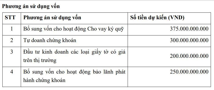 Số tiền huy động được sẽ bổ sung vốn 375 tỷ đồng cho vay ký quỹ, 300 tỷ đồng cho hoạt động tự doanh chứng khoán, 200 tỷ đồng đầu tư kinh doanh các loại giấy tờ có giá trị trên thị trường và 250 tỷ đồng bổ sung vốn cho hoạt động bảo lãnh phát hành chứng khoán.