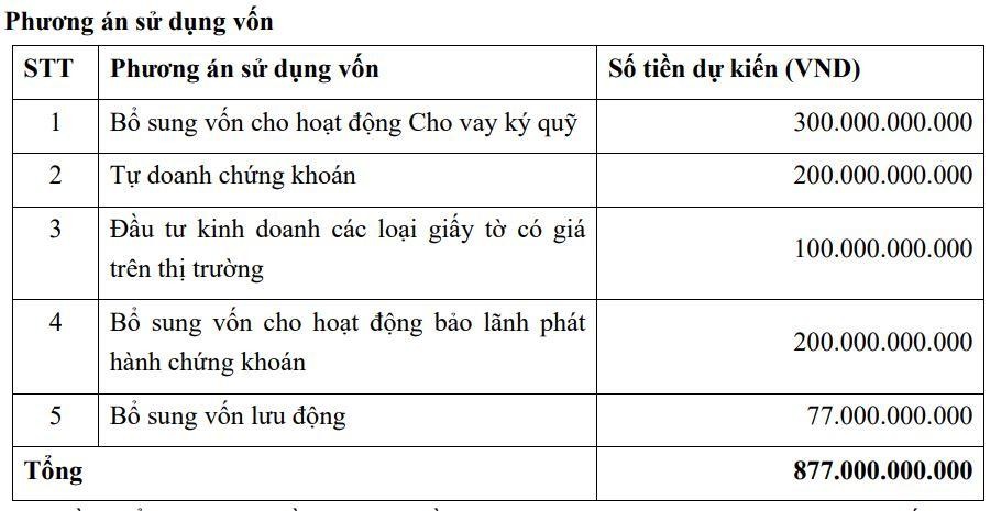 Số tiền huy động được để bổ sung vốn 300 tỷ đồng cho hoạt động cho vay ký quỹ, 200 tỷ đồng cho hoạt động tự doanh chứng khoán, 100 tỷ đồng đầu tư kinh doanh các loại giấy tờ có giá trị, 200 tỷ đồng bổ sung vốn cho hoạt động bảo lãnh phát hành chứng khoán và 77 tỷ đồng bổ sung vốn lưu động.