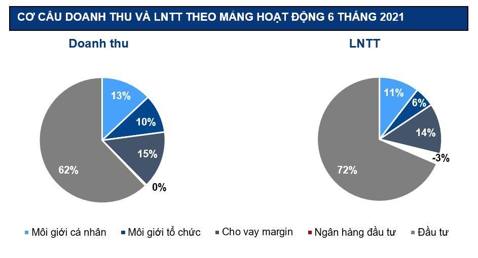 Mảng có tỷ trọng lớn thứ 2 là môi giới, ghi nhận doanh thu 212 tỷ đồng, tăng 101% và lợi nhuận trước thuế đạt 81 tỷ đồng (tăng 144% so với quý II/2020, tăng 29% so với quý I/2021). Trong đó, doanh thu môi giới khối khách hàng cá nhân tăng 126% so với cùng kỳ và tăng 34% so với quý I/2021. Còn doanh thu môi giới tổ chức (tập trung ở các nhà đầu tư nước ngoài) tăng 73% so với quý II/2020 và tăng 14% so với quý trước.