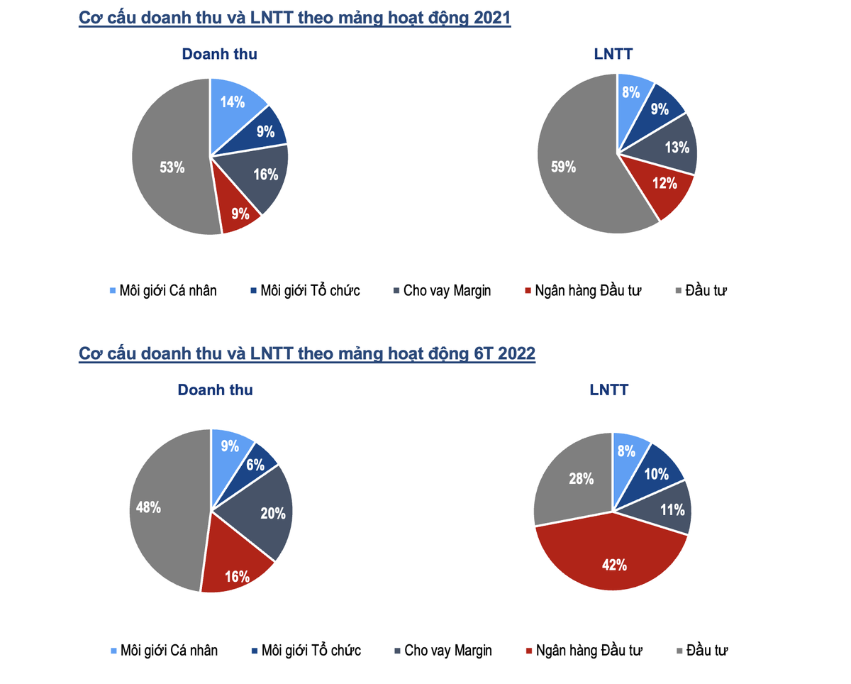 Mảng Đầu tư (tự doanh) ghi nhận doanh thu 748 tỷ đồng trong (giảm 28% 2021) và LNTT đạt 288 tỷ đồng (giảm 49% so với 6 tháng 2021), được đóng góp chủ yếu từ việc bán cổ phiếu của QNS, MWG, HDG và từ hoạt động kinh doanh Chứng quyền Đảm bảo (CW).