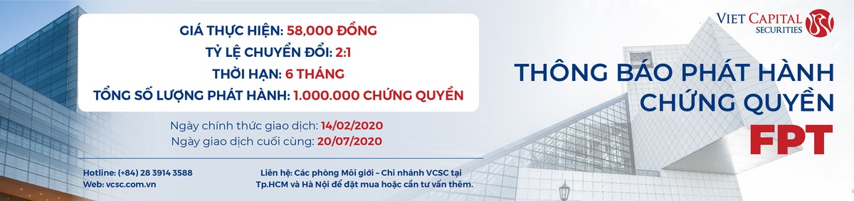 CW FPT do VCSC phát hành có giá thực hiện 58.000 đồng/cp, tỷ lệ chuyển đổi 2:1
