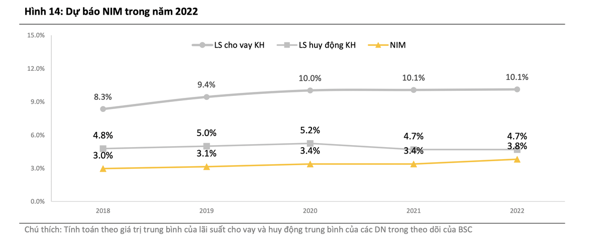 BSC cho rằng, NIM trong năm 2022 sẽ tăng 35 điểm phần trăm so với năm 2021 do phục hồi của nền kinh tế giúp tăng trưởng tín dụng cao, đặc biệt tập trung vào nhóm SME và cá nhân với NIM cao. Ngoài ra, lãi suất cho vay phục hồi sau thời gian hỗ trợ (ước tính hết năm 2021), cùng với đó là tăng cơ cấu CASA trong năm 2022 giúp giảm chi phí vốn.