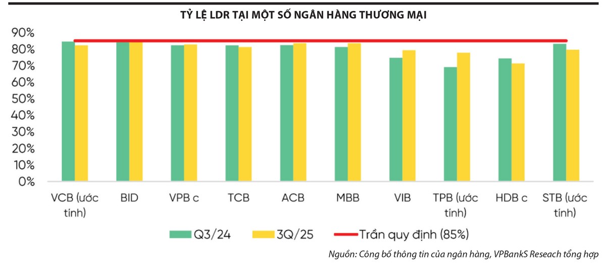 Theo báo cáo này, có thể thấy áp lực thực tế đang tồn tại ngay ở các ngân hàng có vốn Nhà nước chi phối, thể hiện qua mức lãi suất 4,75%/năm - lãi suất trần đối với tiền gửi có kỳ hạn dưới 6 tháng được chào cho khách hàng ưu tiên của Vietcombank và VietinBank trên ứng dụng ngân hàng vào ngày 19/11/2025. Lý do là các ngân hàng cũng phải đẩy mạnh huy động để đảm bảo tỷ lệ LDR đang ở mức cao gần chạm mức trần 85% theo quy định.