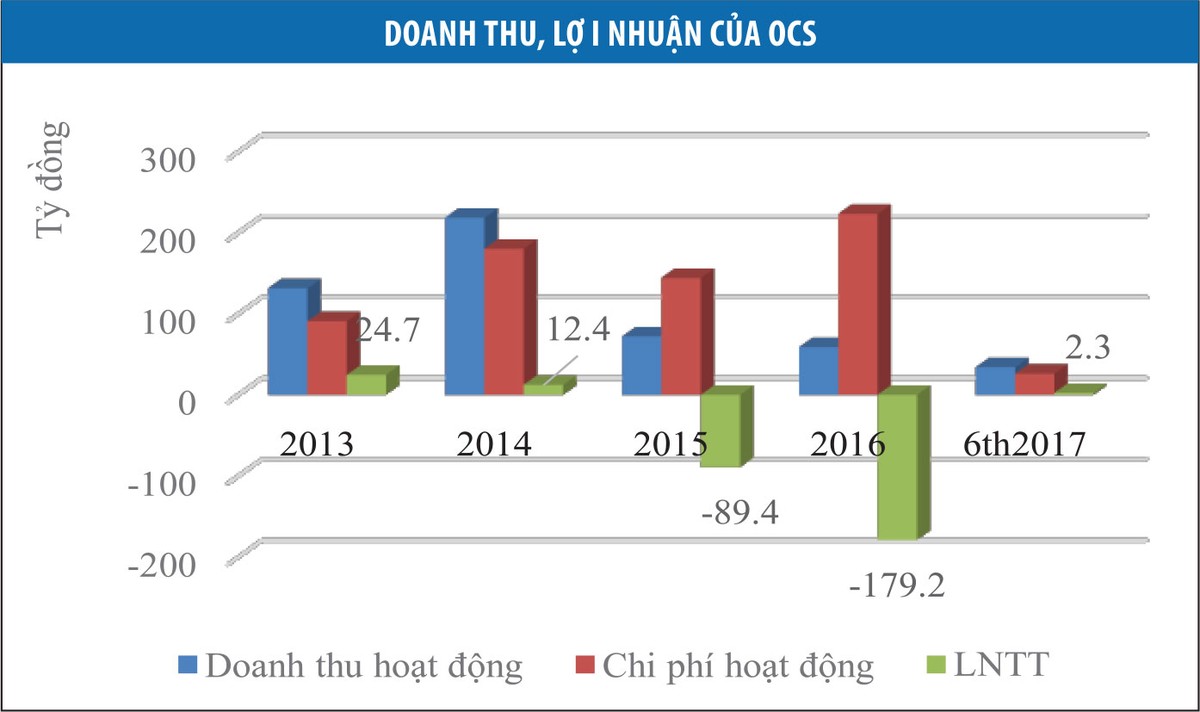 Cụ thể, các báo cáo kết quả kinh doanh của OCS cho thấy, sau “sự biến” năm 2014, doanh thu hoạt động của Công ty giảm mạnh từ 218 tỷ đồng trong năm 2014 xuống 71,8 tỷ đồng năm 2015 và 58,8 tỷ đồng năm 2016. Trong khi đó, chi phí hoạt động tăng cao, chủ yếu do trích lập dự phòng các khoản phải thu khó đòi về giao dịch ký quỹ, khiến lợi nhuận trước thuế năm 2015 âm 89,4 tỷ đồng, năm 2016 âm 179,2 tỷ đồng.