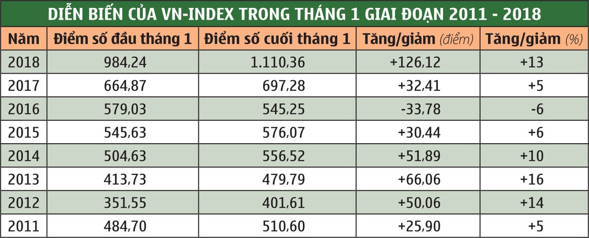 “Hiệu ứng tháng Giêng”- hiện tượng giá cổ phiếu thể hiện xu hướng tăng tích cực trong tháng đầu năm đã được kiểm nghiệm tại nhiều TTCK trên thế giới và thể hiện khá đúng tại Việt Nam trong 8 năm qua. Thống kê VN-Index từ năm 2011 đến nay, chỉ số trong tháng Giêng có diễn biến tăng điểm chiếm ưu thế gần như tuyệt đối, 7/8 năm.