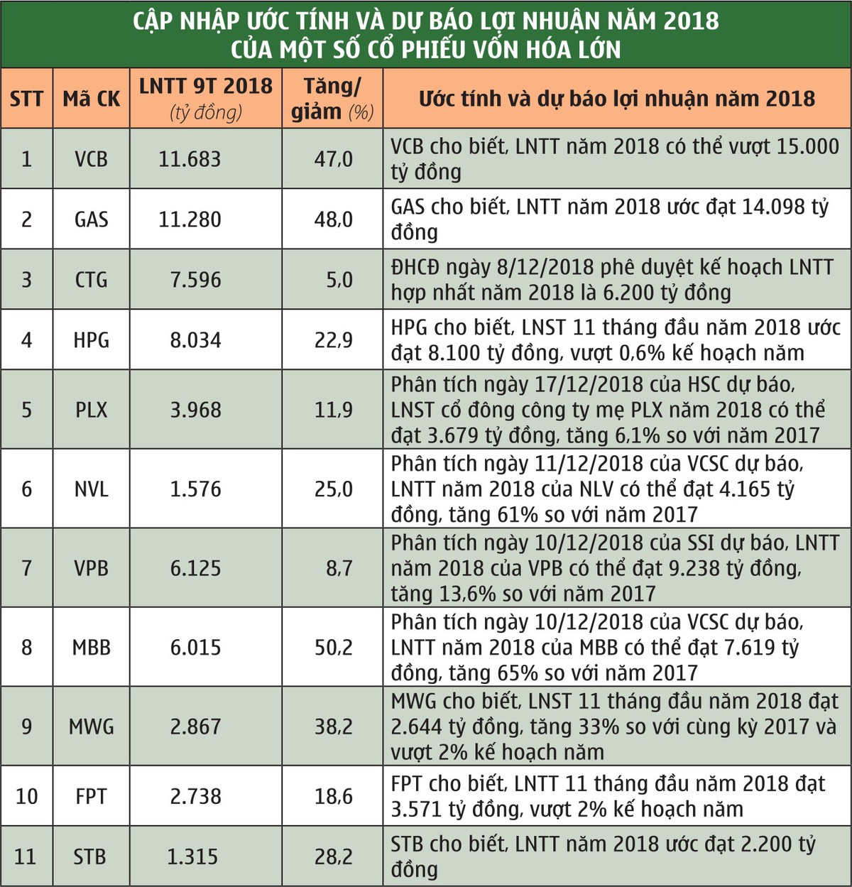 Nhóm cổ phiếu ngân hàng chiếm khoảng 1/4 tổng mức vốn hóa của VN-Index, nên kết quả kinh doanh khả quan sẽ là động lực quan trọng hỗ trợ thị giá cổ phiếu, từ đó tác động tích cực đến xu hướng của thị trường chung. Đây cũng là kỳ vọng tại nhiều cổ phiếu vốn hóa lớn khác như FPT, MWG hay HPG khi lợi nhuận 11 tháng đầu năm 2018 đều vượt kế hoạch cả năm, tương ứng toàn bộ lợi nhuận của tháng 12 sẽ là phần vượt kế hoạch.