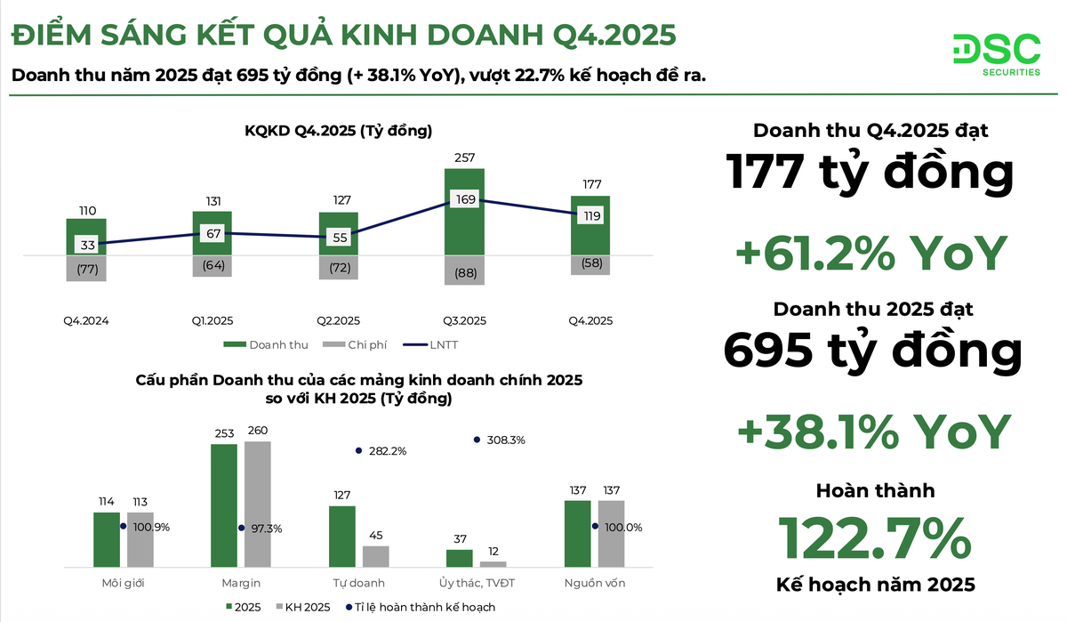 Lũy kế năm 2025, doanh thu của DSC đạt 695 tỷ đồng, tăng 38,1% so với năm 2024 và hoàn thành 122,7% kế hoạch năm; lợi nhuận trước thuế đạt 344 tỷ đồng, tăng trưởng ấn tượng 55,9% và hoàn thành 132% kế hoạch. Đây là mức tăng trưởng nổi bật trong bối cảnh thị trường chứng khoán còn nhiều biến động, cho thấy năng lực thích ứng và điều hành hiệu quả của DSC.
