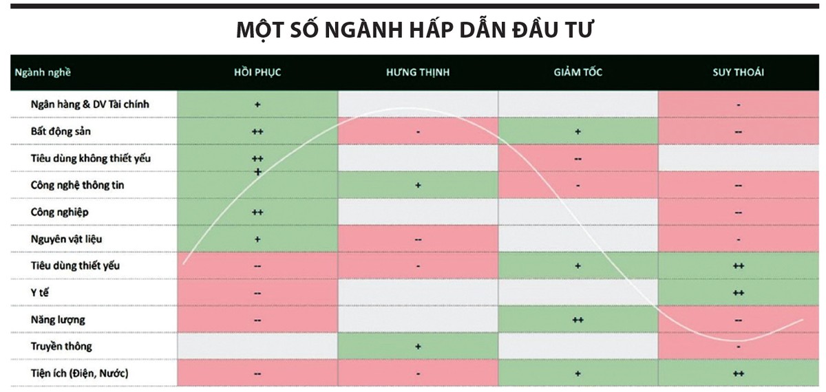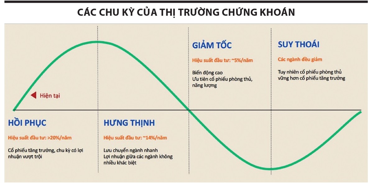 Hiện tại, VN-Index đang ở chu kỳ hồi phục khi hội tụ các yếu tố như lãi suất thấp, vĩ mô ổn định, lợi nhuận doanh nghiệp tạo đáy. Với chu kỳ này, nhà đầu tư có thể đạt hiệu suất vượt trội trên 20%. Trong chu kỳ hồi phục, những ngành có hệ số beta cao, biến động lớn sẽ mang lại hiệu suất đầu tư tốt, chẳng hạn nhóm ngành tiêu dùng không thiết yếu, bất động sản, tài chính - ngân hàng. Ngược lại, nhóm ngành tiêu dùng thiết yếu, y tế, năng lượng, tiện ích (ví dụ điện, nước) thường có hiệu suất thấp hơn.