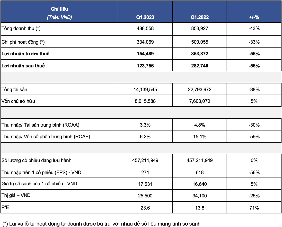 Thu nhập trên một cổ phiếu (EPS) quý I/2023 đạt 271 đồng/cổ phiếu. Hệ số thu nhập trên vốn cổ phần (ROAE) 6,2%.