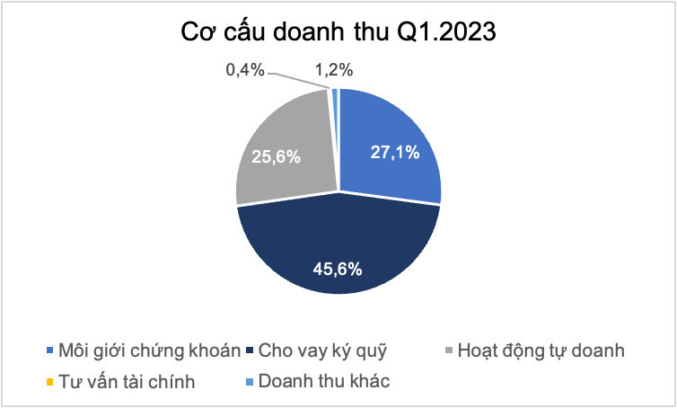 Doanh thu môi giới chứng khoán chiếm 27% tổng doanh thu của HSC, đạt 132 tỷ đồng, giảm 53% so với cùng kỳ năm 2022. Doanh thu từ các hoạt động cho vay ký quỹ đạt 223 tỷ đồng, giảm 40% so với cùng kỳ và đóng góp 45,6% vào tổng doanh thu. Hoạt động đầu tư tự doanh đạt hơn 125 tỷ đồng, giảm 33% so với năm ngoái, đóng góp 25,6% vào tổng doanh thu.