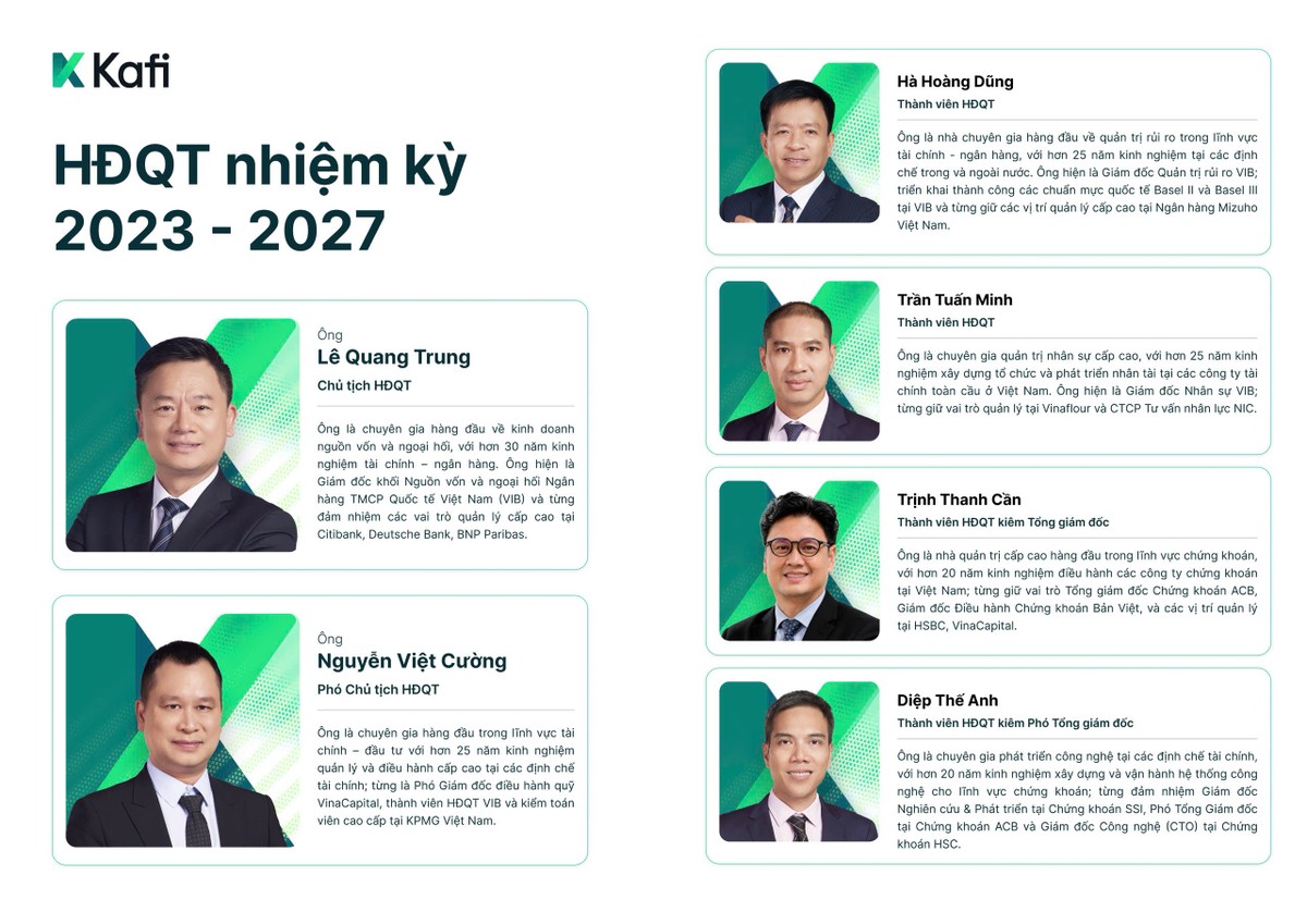Hội đồng Quản trị Kafi hiện gồm: Ông Nguyễn Việt Cường - Phó chủ tịch thường trực HĐQT, ông Trần Tuấn Minh - Thành viên HĐQT, ông Hà Hoàng Dũng - Thành viên HĐQT, ông Trịnh Thanh Cần - Thành viên HĐQT kiêm Tổng giám đốc, ông Diệp Thế Anh - Thành viên HĐQT kiêm Phó tổng giám đốc…. Với kinh nghiệm sâu rộng trong lĩnh vực tài chính, đầu tư và công nghệ, đội ngũ lãnh đạo mới được kỳ vọng sẽ tiếp tục phát huy nền tảng đã được xây dựng, đồng thời mang đến những góc nhìn đổi mới, thúc đẩy năng lực cạnh tranh và tăng trưởng của Kafi trong giai đoạn tới.