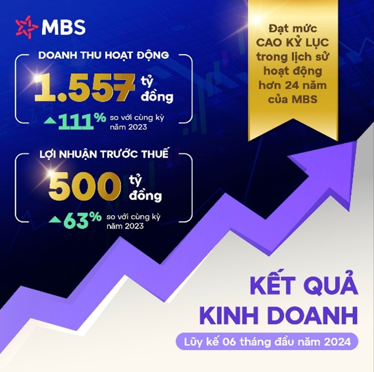 6 tháng đầu năm 2024, MBS ghi nhận kết quả doanh thu hoạt động tăng hơn gấp đôi, lợi nhuận trước thuế tăng 63% so với cùng kỳ 2023; đánh dấu mức cao kỷ lục