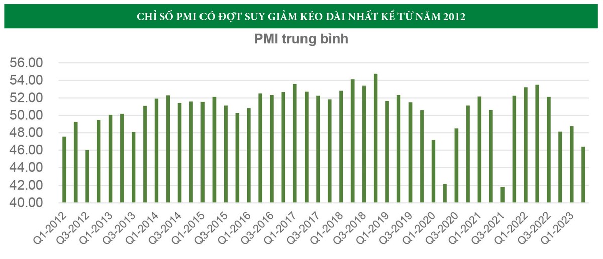 Ở vùng vĩ mô xấu, thông tin tiêu cực về nền kinh tế là chuyện bình thường và không có gì đáng nói. Tuy nhiên, khi thị trường chứng khoán hưng phấn và các chính sách hỗ trợ được đưa ra gần hết, đó sẽ là câu chuyện nền kinh tế đáp ứng tương xứng như thế nào với kỳ vọng của thị trường. Dữ liệu GDP, hay PMI đều cho thấy ngành sản xuất Việt Nam đã có 3 quý suy giảm liên tiếp. Đây là đợt suy giảm kéo dài nhất kể từ năm 2012, nếu bỏ qua giai đoạn 2020 bất khả kháng vì đại dịch Covid-19. Nghĩa là khu vực sản xuất đang cực kỳ yếu trong điều kiện bình thường mới.