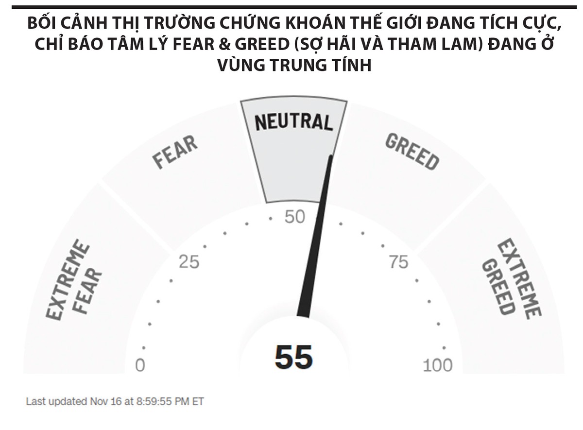 Thứ nhất, bối cảnh thị trường chứng khoán thế giới đang tốt hơn rất nhiều so với thời điểm năm 2022. Tại Mỹ, chỉ số S&P 500 không ở trong pha giảm, tâm lý của nhà đtầu tư rất tích cực sau khi số liệu CPI tháng 10 tốt hơn kỳ vọng, chỉ báo tâm lý Fear & Greed (sợ hãi và tham lam) đang ở vùng trung tính và còn có dư địa để tiếp tục lạc quan.