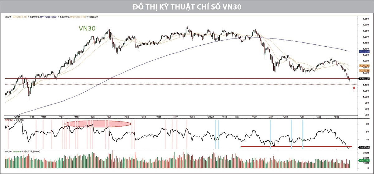 Nhưng điểm nhấn chính với VN30 có lẽ đến từ chỉ báo RSI. Cụ thể, RSI đã chính thức về thời điểm thấp nhất kể từ năm 2021. Theo đó, dòng tiền bắt đáy sẽ trở nên rất nhạy cảm trong những thời điểm xuất hiện tín hiệu Mua lên và có khả năng đẩy giá vọt lên vùng kháng cự 1.200 điểm chỉ trong một vài phiên ngắn.