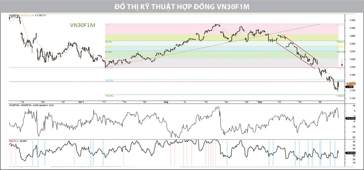 Nhìn chung, xu hướng giá điều chỉnh giảm được khẳng định rất rõ ràng, với nhịp giảm tiếp diễn kéo dài. Nhưng với bản chất của thị trường xu hướng giá xuống, việc nhà đầu tư theo lệnh Short tại những thời điểm chỉnh sâu lại là rủi ro cao vì dòng tiền bắt đáy thường tham gia khá bất ngờ. Xét về mặt chỉ báo, trạng thái Bán cạn kiệt thấy rõ tại vùng giá thấp hơn 1.200 điểm. Cụ thể, thanh khoản giảm với những thời điểm bán ra và lực bắt đáy xuất hiện đi kèm sự sôi nổi giao dịch.