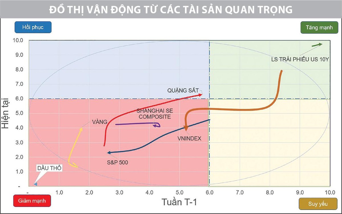Nhìn vào đồ thị, các vận động của nhóm tài sản quan trọng thực tế không thay đổi nhiều so với tuần trước đó, ngoại trừ chỉ số VN-Index “lao dốc” một cách bất ngờ. Đường đi của đồ thị VN-Index thay vì hướng xuống với góc bằng, thì gần như đi thẳng đứng theo hướng xuống. Ngược lại, trạng thái từ tài sản đại diện hàng hóa là quặng sắt ghi nhận tăng trưởng. Bên cạnh đó, vàng cũng ghi nhận tín hiệu phục hồi trở lại, mặc dù vẫn nằm gọn trong khu vực chu kỳ “giảm mạnh”.