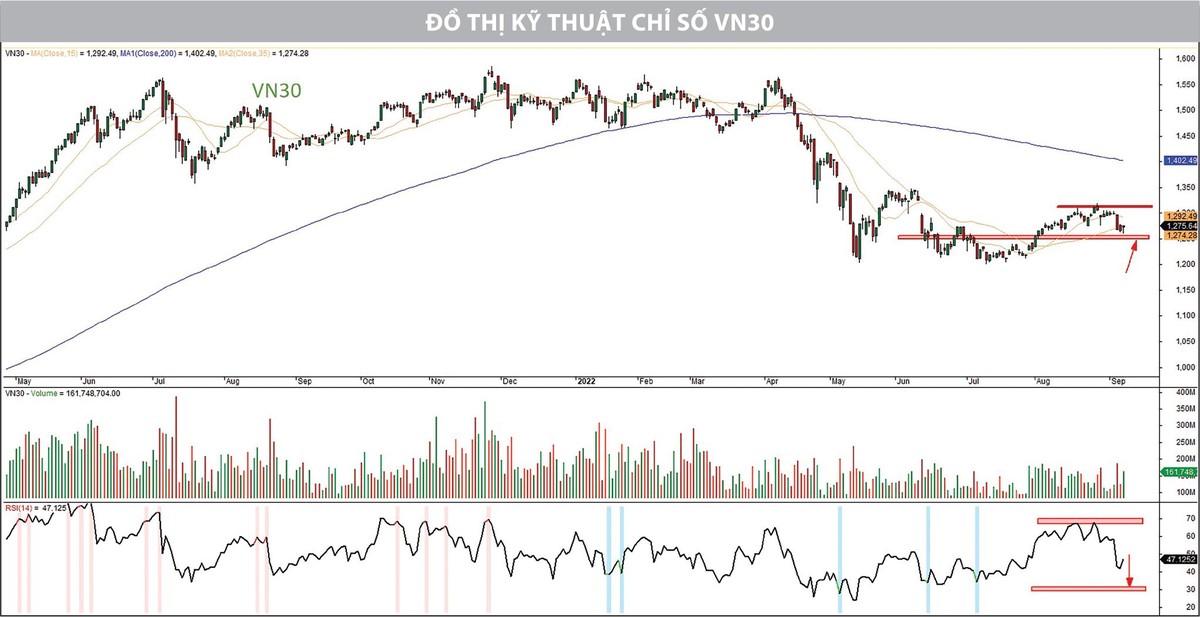 Điểm nhấn với đồ thị kỹ thuật VN30 là khoảng hở Gap (khoảng trống giá) được tạo ra từ thời điểm ngày 10/6. Khoảng hở lớn với khối lượng giao dịch tương đối cao trở thành một vùng “nhiễu sóng” cho rất nhiều nhà đầu tư tham gia trong tháng 9/2022.