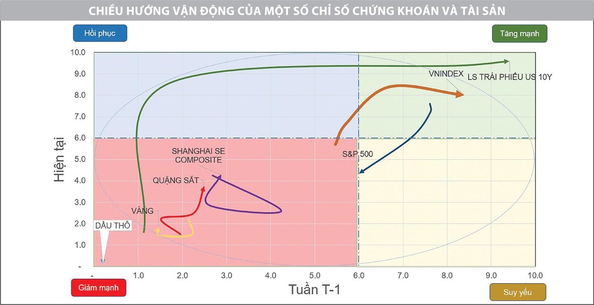 Dựa trên yếu tố chu kỳ tài sản, rõ ràng đây chưa phải là thời điểm kỳ vọng VN-Index sẽ xác lập xu hướng mới, khi đường biểu thị vận động từ chỉ số này bắt đầu có sự chuyển hướng. Nếu theo đúng trạng thái dẫn dắt được xác nhận từ S&P 500, thì VN-Index có thể chuyển từ trạng thái tăng mạnh hướng về vùng suy yếu. S&P 500 thực tế cũng đã phải trải qua gần 10 phiên điều chỉnh liên tiếp khi di chuyển từ vùng tăng mạnh về vùng suy yếu.