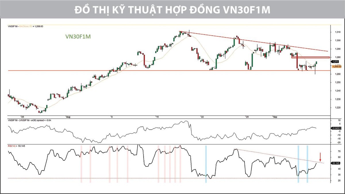 Dựa vào vận động từ đồ thị kỹ thuật, điểm dễ nhận ra nhất với VN30F2209 là mẫu hình cái nêm, khi giá không mất nền, nhưng lại giảm dần đà tăng trong thời gian qua. Vùng nền được khẳng định khá rõ tại thềm giá 1.264 điểm là một trong những điểm chạm mua lên khá hợp lý. Thực tế, đây cũng là những thời điểm động lượng RSI ghi nhận phân kỳ dương với giá, tạo cơ hội lướt sóng cho nhà đầu tư có kinh nghiệm. Dự báo, đây sẽ là điểm nhấn cho chiến lược thị trường trong tuần đáo hạn VN30F2209, canh mua trong vùng 1.260 - 1.265 điểm.