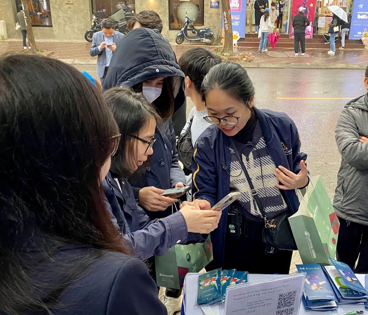 Các bạn trẻ tò mò khi gian hàng chứng khoán xuất hiện tại một sự kiện văn hóa.