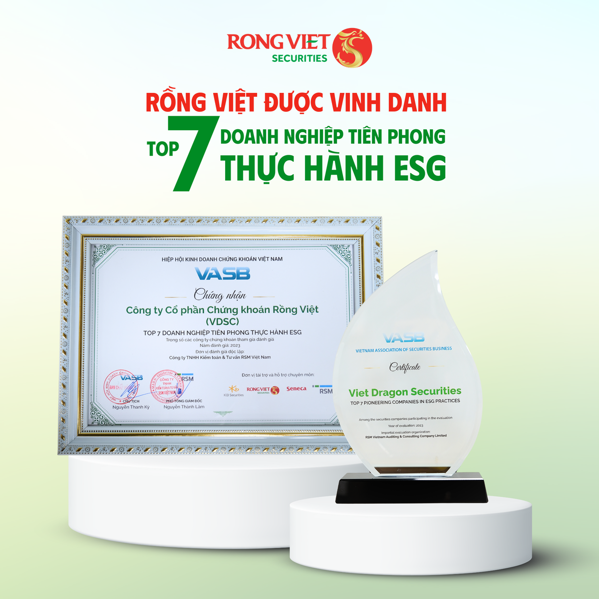 Tháng 12/2024, Rồng Việt vinh dự là một trong 07 công ty chứng khoán dẫn đầu về thực hành ESG do Hiệp hội Kinh doanh Chứng khoán Việt Nam (VASB) phối hợp cùng Công ty TNHH Kiểm toán & Tư vấn RSM và nền tảng công nghệ Seneca ESG đánh giá cho dự án thí điểm trong chuỗi các hoạt động đánh giá ESG tại 34 công ty chứng khoán thành viên của VASB, hướng tới mục tiêu nâng cao nhận thức và thực hành ESG trong ngành chứng khoán. Danh hiệu này là sự ghi nhận cho chiến lược dài hạn và những nỗ lực bền bỉ của Rồng Việt trong việc tiên phong thực hành ESG trong ngành Chứng khoán, đồng thời khẳng định cam kết không ngừng nghỉ của Rồng Việt trên con đường phát triển bền vững.