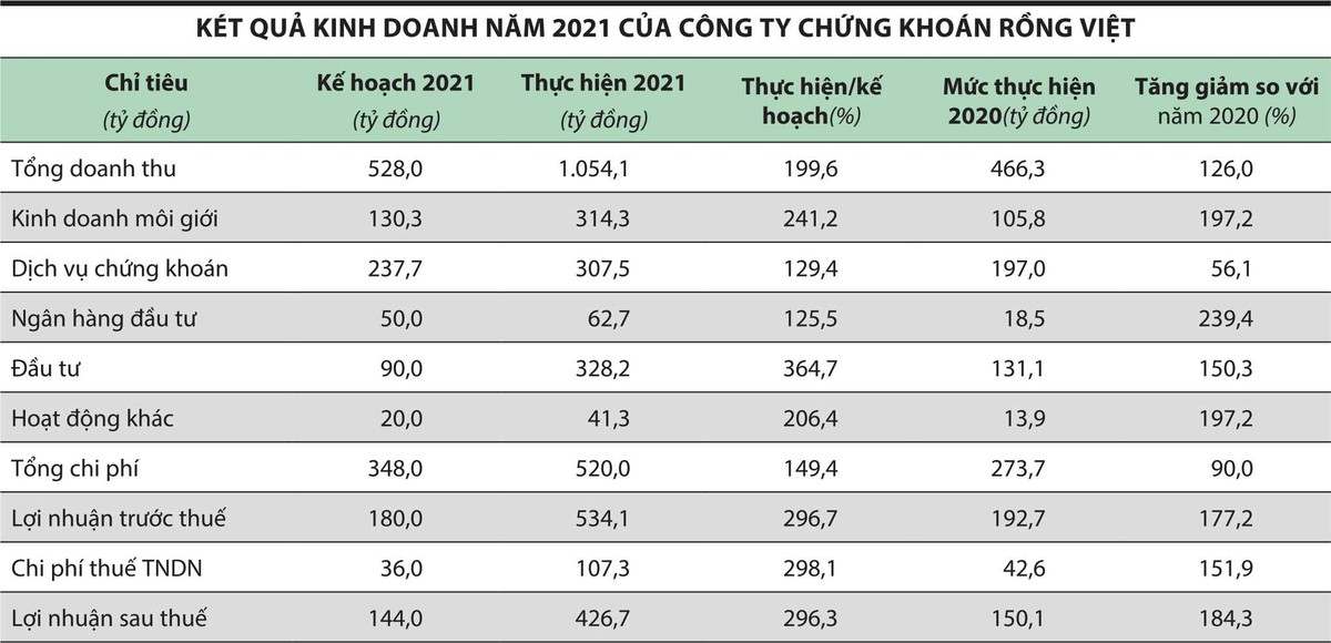 Kết thúc năm 2021, Chứng khoán Rồng Việt ghi nhận tổng doanh thu hợp nhất hơn 1.054 tỷ đồng, vượt 99,6% kế hoạch năm 2021 và tăng 126,0% so với thực hiện năm 2020. Lợi nhuận sau thuế hợp nhất đạt 426,7 tỷ đồng, vượt 196,3% kế hoạch năm và tăng 184,3% so với năm 2020.